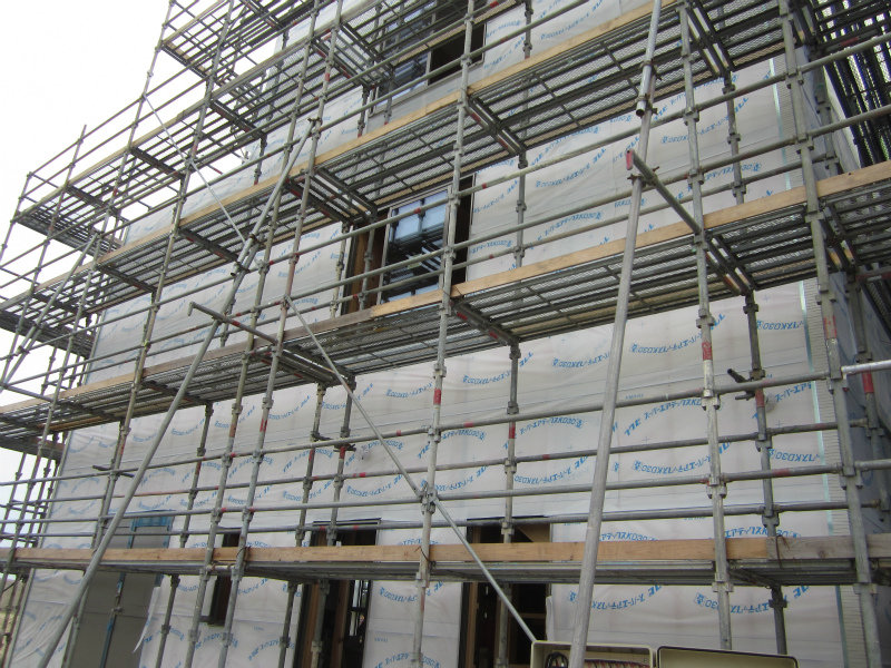 外断熱工法の断熱材が張り終わって、外壁張りが始まっていました。
